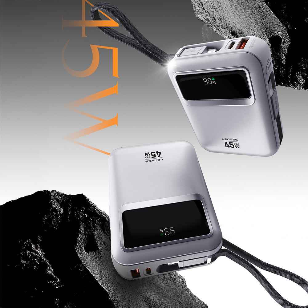 Lenyes C04-A, 45W Type-C ve 27W Lightning kablolarını gövdesinde taşıyan akıllı tasarımıyla, ekstra kablo arama derdini tamamen ortadan kaldırır. 20.000mAh yüksek kapasitesi sayesinde gün boyu dışarıda olsan bile telefonunu, tabletini veya kulaklığını defalarca şarj edebilirsin. Evde film izlerken cihazın şarjı düşse, dışarıda uzun iş günlerinde yoğun kullanım yapsan ya da seyahat esnasında navigasyon açık şekilde ilerlesen bile C04-A seni asla yarı yolda bırakmaz. LED ekranı ile pil seviyesini %1 hassasiyetle takip edebilir, ne zaman şarj etmen gerektiğini tam zamanında görebilirsin.