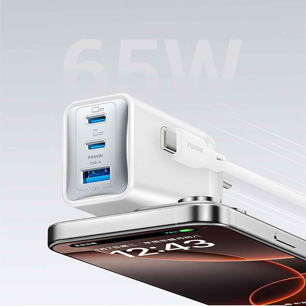 Cihaz üzerinde bulunan 2 adet Type-C portu ve 1 adet USB-A portu, aynı anda birden fazla cihazı verimli şekilde şarj etmenize imkan tanır. Akıllı güç yönetim sistemi, her cihaza ihtiyacı olan doğru akımı otomatik olarak yönlendirerek dengeli ve hızlı bir şarj süreci sağlar. Kutu içerisindeki 65W destekli silikon Type-C to Type-C kablo ise dayanıklı, yumuşak yüzeyli ve dolaşmaya karşı dirençli yapısıyla uzun ömürlü kullanım sunar.