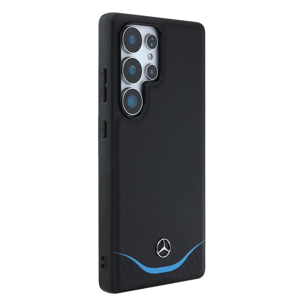 Galaxy S25 Ultra Kılıf Mercedes Benz Orjinal Lisanslı M-safe Şarj Özellikli 3D Metal Logolu Mavi Yatay Eğri Çizgili Deri Kapak